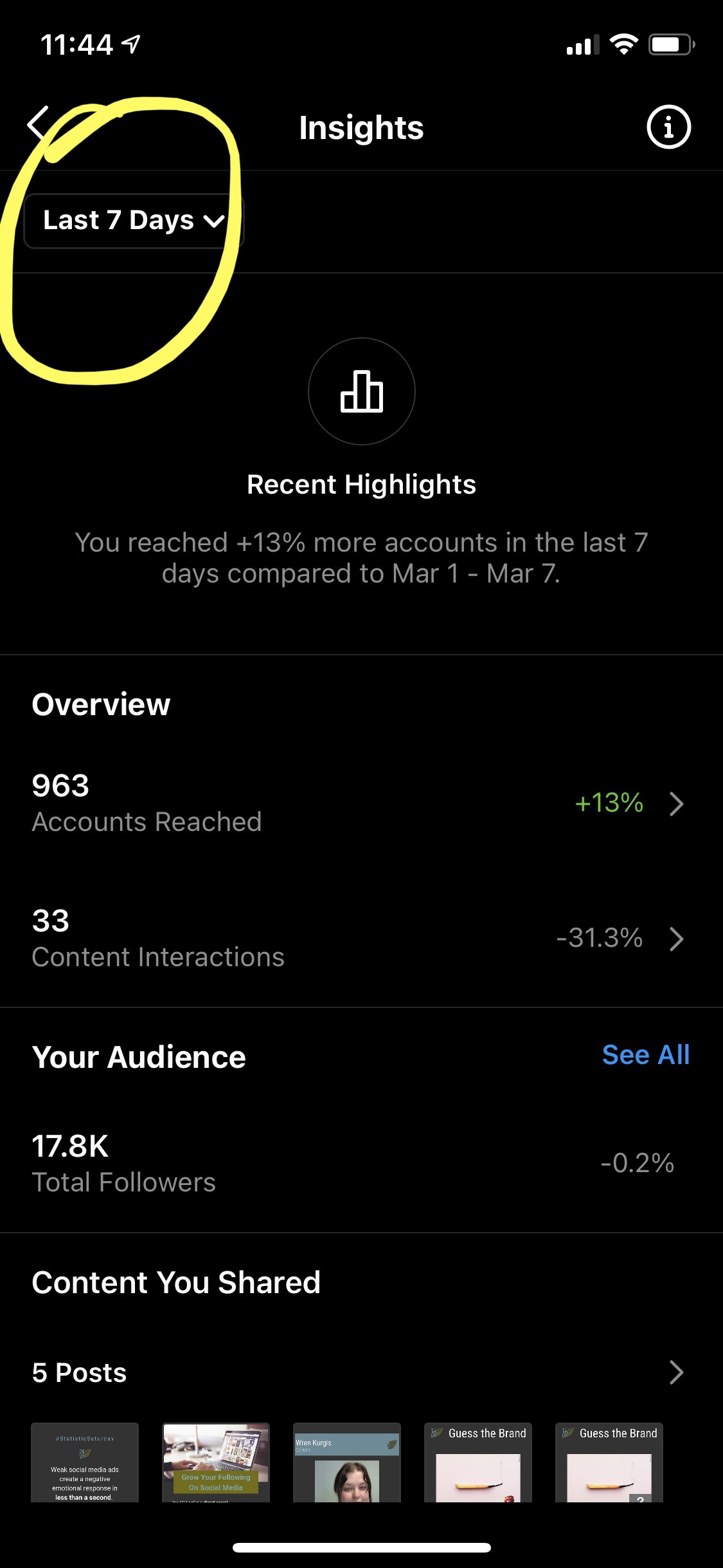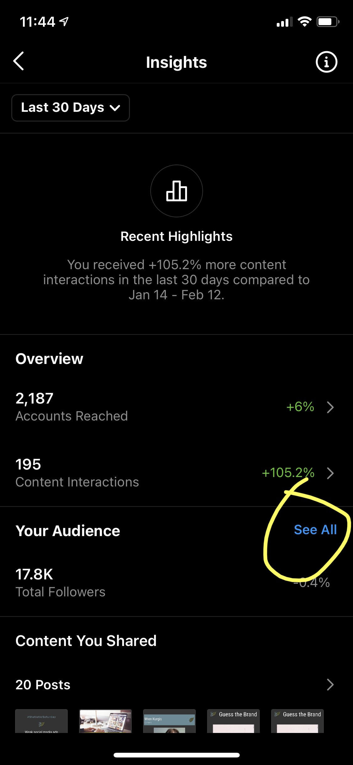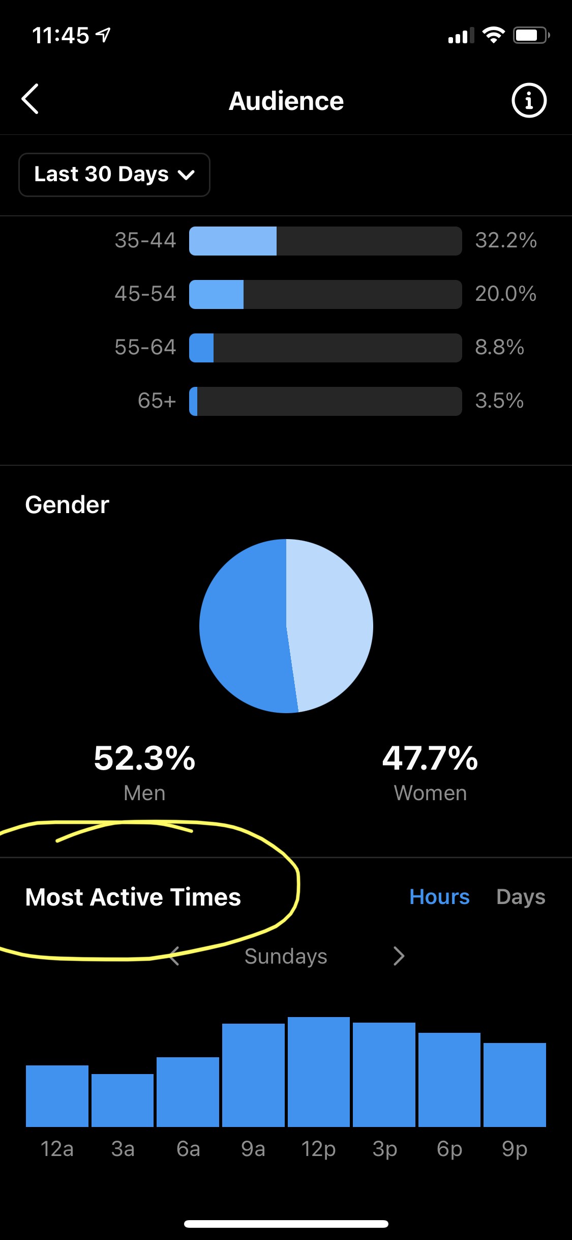 When looking at your Instagram profile’s main screen (hint: make sure your profile is converted to a Business Profile), click on the “Insights” button. From there, ensure you’re looking at a 30-day overview as 7-day analytics can provide a false positive or a false negative. The more data you’re taking into consideration, the better. Select “See All” next to the “Your Audience” section. Then, scroll down to the bottom, and you’ll be able to see the Hours or Days your audience is most active. Here’s a step-by-step breakdown for my visual learners: